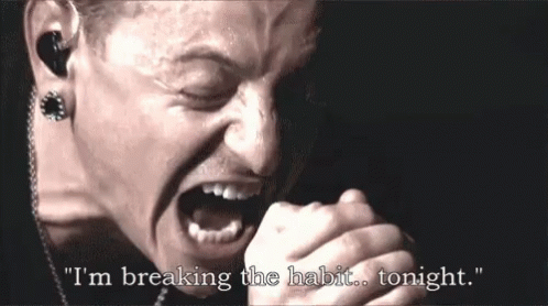 Chester singing "Breaking the Habit" a popular song by Linkin Park, released in 2003 as part of their album "Minutes to Midnight". The song is also known for its heavy guitar riffs, emotional vocals, and thought-provoking lyrics.
